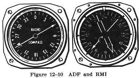 The more commonly used ADF instrument has a stationary azimuth dial graduated from 0 degrees up to 360 degrees (with 0 degrees at the top of the instrument to represent the airplane's nose). In this type, the bearing pointer shows only the station's relative bearing, i.e., the angle from the nose of the airplane to the station (Fig. 12-10). A more sophisticated instrument called a Radio Magnetic Indicator (RMI) uses a 360 degree azimuth dial which, being slaved to a gyro compass, rotates as the airplane turns and continually shows the Magnetic Heading at the top of the instrument. Thus, with this rotating azimuth referenced to a magnetic direction, the bearing pointer superimposed on the azimuth indicates the Magnetic Bearing to the station.
