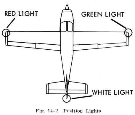 An anticollision light system, including a flashing or rotating beacon and position lights, is required airplane equipment. Airplane position lights are arranged similar to those of boats and ships. A red light is positioned on the left wingtip, a green light on the right wingtip, and a white light on the tail (Fig. 14-2). This arrangement provides a means by which pilots can determine the general direction of movement of other airplanes in flight just as sailors determine the direction of boats and ships. If both a red and green light of another airplane are observed, the airplane would be flying in a general direction toward the pilot seeing the lights, and could be on a collision course. If only a red light is seen, the airplane is traveling from right to left in relation to the observing pilot. On the other hand, if only a green light is observed, the airplane is traveling from left to right.