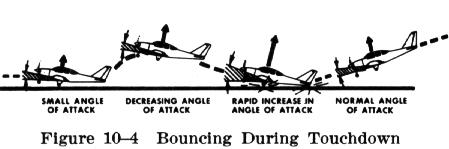 When the airplane contacts the ground with a sharp impact as the result of an improper attitude or an excessive rate of sink, it tends to "bounce" back into the air. Though the airplane's tires and shock struts provide some springing action, the airplane does not bounce as does a rubber ball. Instead, it rebounds into the air because the wing's angle of attack was abruptly increased, producing a sudden addition of lift (Fig. 10-4).
