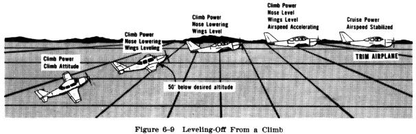 To return to straight and level flight from a climbing attitude, it is necessary to start the level off approximately 50 feet below the desired altitude. While approaching that altitude, the wings should be leveled and the nose lowered to the level flight attitude. The nose must be lowered gradually, however, because a loss of altitude will result if the pitch attitude is decreased to the cruising level flight position without allowing the airspeed to increase proportionately. As the nose is lowered and the wings leveled, the airplane should be retrimmed (Fig. 6-9).