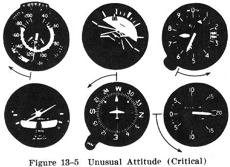 When a critical attitude is noted on the flight instruments, the immediate problem is to recognize what the airplane is doing and decide how to return it to straight and level flight as quickly as possible (Fig. 13-5).