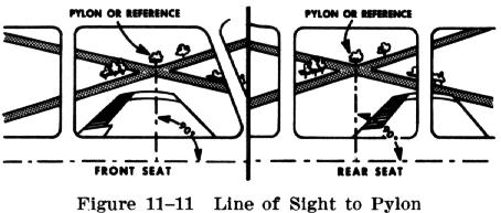 In explaining the performance of eights on pylons the term "wingtip" is frequently considered as being synonymous with the proper reference line, or pivot point on the airplane. This interpretation, however, is not always correct. High wing, low wing, swept wing and taper wing airplanes, as well as those with tandem or side by side seating, will all present different angles from the pilot's eye to the wingtip (Fig. 11-11). Therefore, in the correct performance of eights on pylons, as in other maneuvers requiring a lateral reference, the pilot should use a sighting reference line which, from eyelevel, parallels the lateral axis of the airplane.
