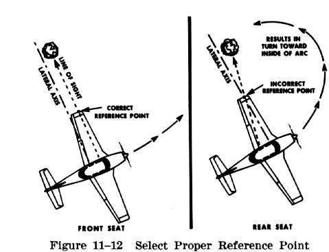 To demonstrate this, the airplane is flown at normal cruising speed at an altitude estimated to be below the proper pivotal altitude, and then placed in a medium banked turn. It will be seen that the projected reference line of sight appears to move forward along the ground as the airplane turns.