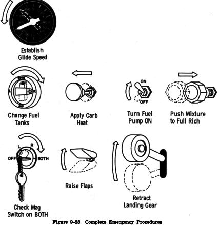 : EMERGENCY PROCEDURES : : : : Engine Failure : : Airspeed - Glide : : Fuel selector - fullest tank : : Fuel pump - ON : : Mixture - RICH : : Carb heat - ON : : Magneto switch - BOTH : : Flaps - UP : : Gear - UP : : Seat belts - fastened : : : : EMERGENCY LANDING : -------------------------------------- Fig. 9-22 Check the Critical Items |