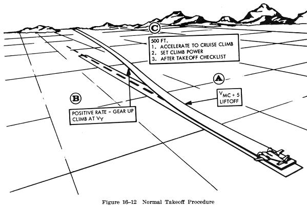 The light twin can be controlled satisfactorily while firmly on the ground when one engine fails prior to reaching Vmc during the takeoff roll. This is possible by closing both throttles, by proper use of rudder and brakes, and with many airplanes, by use of nosewheel steering. If the airplane is airborne at less than Vmc, however, and suddenly loses all power on one engine, it cannot be controlled satisfactorily. Thus, on normal takeoffs, liftoff should never take place until the airspeed reaches and exceeds Vmc. The FAA recommends a minimum speed of Vme plus 5 knots before liftoff. From this point, an efficient climb procedure should be followed (Fig. 16-12).