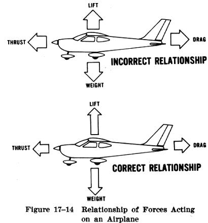 Often the relationship between the four forces has been erroneously explained or illustrated in such a way that this point is obscured. Consider Figure 17-14, for example. In the upper illustration the force vectors of thrust, drag, lift, and weight appear to be equal in value. The usual explanation states (without stipulating that thrust and drag do not equal weight and lift) that thrust equals drag and lift equals weight as shown in the lower illustration. This basically true statement must be understood or it can be misleading. It should be understood that in straight, level, unaccelerated flight, it is true that the opposing lift/weight forces are equal but they are also greater than the opposing forces of thrust/drag that are equal only to each other; not to lift/weight. If we are to be quite correct about this matter, we must say that in steady flight |