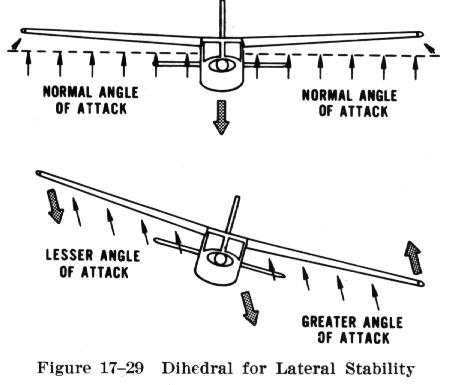 If a momentary gust of wind forces one wing of the airplane to rise and the other to lower, the airplane will bank. When the airplane is banked without turning, it tends to sideslip or slide downward toward the lowered wing (Fig. 17-29). Since the wings have dihedral, the air strikes the low wing at much greater angle of attack than the high wing. This increases the lift on the low wing and decreases lift on the high wing, and tends to restore the airplane to its original lateral attitude (wings level); that is, the angle of attack and lift on the two wings are again equal.