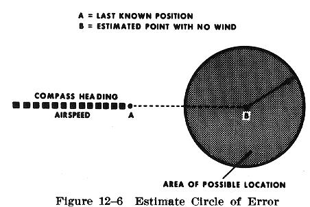 When unsure of one's position, the pilot should continue to fly the original heading and watch for recognizable landmarks, while rechecking the calculated position. By plotting the estimated distance and compass direction flown from the last noted checkpoint as though there were no wind, the point so determined will be the center of a circle within which the airplane's position may be located (Fig. 12-6). This is often called a "circle of error." If it is certain that the wind is no more than 30 knots, and it has been 30 minutes since the last known checkpoint was noted, the radius of the circle should be about 15 nautical miles. It is then a matter of continuing straight ahead, and checking landmarks within this circle. The most likely position will be downwind from the desired course.