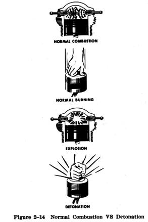 A flame front starts at the spark plugs and travels across the combustion chamber at a speed of approximately 70 to 100 feet per second. The velocity of the flame front is influenced by the type of fuel, the ratio of fuel to air mixture, the pressure on the fuel/air mixture, and the temperature of the fuel/air mixture. The pilot has control of these items by ensuring that (1) the airplane has been serviced with the recommended grade of fuel; (2) the pressure of the fuel/air mixture is properly regulated by propeller and throttle controls; (3) the engine temperature is adequately regulated by use of the cowl flaps and by the engine speed when an internal supercharger is used; and (4) the fuel/air ratio is accurately adjusted by the mixture control. When any of these factors is not properly controlled, abnormal combustion will result. When the fuel/air mixture is ignited by means other than the normal spark ignition, the result is abnormal combustion. This abnormal combustion is divided into two distinct types - detonation and preignition. |