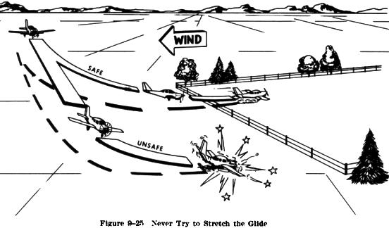 Unlike a "normal approach" when the power setting is variable, on a "power off approach" the power is fixed at the idle setting. Therefore, pitch attitude rather than power must be adjusted to control the airspeed. This, of course, also changes the glide or descent angle. By lowering the nose to keep the approach airspeed constant, the descent angle will steepen. If the approach is too high, lower the nose; when the approach is too low, raise the nose. However, if the pitch attitude is raised too high, the airplane will settle very rapidly due to a slow airspeed and insufficient lift. For this reason, NEVER TRY TO STRETCH A GLIDE to reach the desired landing spot (Fig. 9-25).