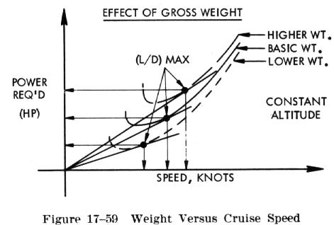 The flight condition of maximum lift/drag ratio is achieved at one particular value of lift coefficient for a given airplane configuration. Hence, a variation of gross weight will alter the values of airspeed, power required, and specific range obtained at the maximum lift/drag ratio.