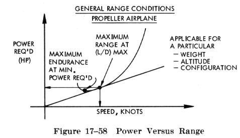 The maximum endurance condition would be obtained at the point of minimum power required since this would require the lowest fuel flow to keep the airplane in steady, level flight. Maximum range condition would occur where the proportion between speed and power required is greatest (Fig. 17-58). The maximum range condition is obtained at maximum lift/drag ratio (L/D max) and it is important to note that for a given airplane configuration, the maximum lift/drag ratio occurs at a particular angle of attack and lift coefficient, and is unaffected by weight or altitude.