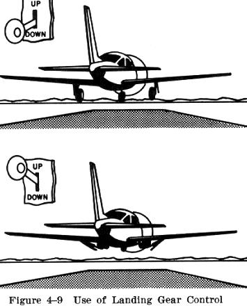 The control for operating the landing gear is a switch or lever, often in the shape of a wheel (to differentiate from the flap control which has an airfoil shape), on the instrument panel. When the control is moved to the DOWN position, the gear will extend; when the control is moved to the UP position the gear will retract. In addition to this operating control, an indicator or warning light is located on the instrument panel to show the position of the gear. The landing gear should be operated only when the airspeed is at or below the airplane's maximum landing gear operating speed (Vlo). Operating at a higher airspeed may cause damage to the operating mechanism. When the gear is down and locked, the airplane should not be operated in excess of the airplane's maximum landing gear extended speed. (Vle). It is extremely important that the pilot form the habit of positively identifying the landing gear control before attempting to use it to raise or lower the gear. Otherwise the pilot may inadvertently use the flap control and operate the flaps instead of the gear. |