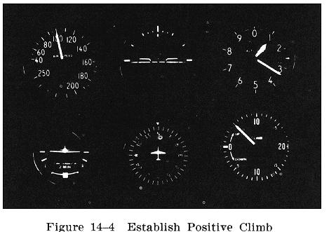 Necessary pitch adjustments to establish a stabilized climb should be made with reference to the attitude indicator. At the same time the wings should be checked for a level attitude using the attitude indicator and the heading indicator. It is recommended that no turn be made until reaching a safe maneuvering altitude.