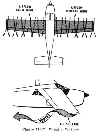 | As we have already learned the action of the airfoil that gives an airplane lift also causes induced drag. The explanation of this was discussed in preceding sections of this chapter. It was determined that when a wing is flown at a positive angle of attack, a pressure differential exists between the upper and lower surfaces of the wing; that is - the pressure above the wing is less than atmospheric pressure and the pressure below the wing is equal to or greater than atmospheric pressure. Since air always moves from high pressure toward low pressure, and the path of least resistance is toward the airplane's wingtips, there is a spanwise movement of air from the bottom of the wing outward from the fuselage around the wingtips. This flow of air results in "spillage" over the wingtips, thereby setting up a whirlpool of air called a "vortex" (Fig. 17-17). At the same time the air on the upper surface of the wing has a tendency to flow in toward the fuselage and off the trailing edge. This air current forms a similar vortex at the inboard portion of the trailing edge of the wing, but because the fuselage limits the inward flow, the vortex is insignificant. Consequently, the deviation in flow direction is greatest at the wingtips where the unrestricted lateral flow is the strongest. As the air curls upward around the wingtip it combines with the wing's downwash to form a fast spinning trailing vortex. These vortices increase drag because of energy spent in producing the turbulence. It can be seen, then, that whenever the wing is producing lift, induced drag occurs, and wingtip vortices are created. |
