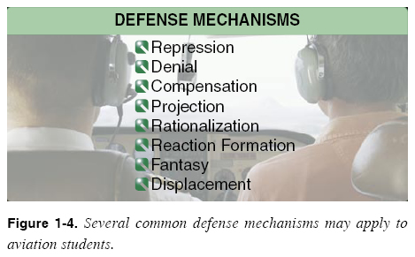 Human Factors That Inhibit Learning Defense Mechanisms Defense mechanisms can be biological or psychological. The biological defense mechanism is a physiological response that protects or preserves organisms. For example, when humans experience a danger or a threat, the “fight or flight” response kicks in. Adrenaline and other chemicals are activated and physical symptoms such as rapid heart rate and increased blood pressure occur. An example of this might occur when an anxious student pilot is learning to place the aircraft (helicopter) in an autorotative descent, which is used in the event of engine failure or tail rotor failure. Emergency procedure training is necessary to practice as the outcome of a true emergency is directly related to the pilot’s ability to react instantly and correctly, and in taking the proper corrective action since there may be limited time to analyze the problem. The anxiety that the student pilot may feel while practicing such maneuvers may resolve itself into a “fight or flight” response. The instructor needs to recognize the student’s apprehension about performing the autorotation and help the student gain the necessary skill level to feel comfortable with the maneuver. In this case, the instructor could take the procedure apart and demonstrate each stage of an autorotation. Allowing the student to then practice the stages at various heights should instill the confidence needed to perform the autorotation. Sigmund Freud introduced the psychological concept of the ego defense mechanism in 1894. The ego defense mechanism is an unconscious mental process to protect oneself from anxiety, unpleasant emotions, or to provide a refuge from a situation with which the individual cannot currently cope. For example, someone who blots out the memory of being physically assaulted is using a defense mechanism. People use these defenses to prevent unacceptable ideas or impulses from entering the conscience. Defense mechanisms soften feelings of failure, alleviate feelings of guilt, help an individual cope with reality, and protect one’s self-image. [Figure 1-4]