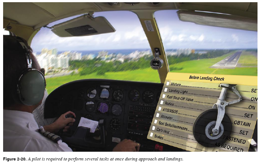 It is important to note that the ability to simultaneously perform tasks is a fragile phenomenon. For example, suppose Beverly is performing the basic attitude control task and communicating with ATC when she suddenly encounters turbulence. The attitude control task quickly increases in difficulty and begins to require more and more deliberate attention. Her ability to perform both tasks simultaneously quickly degrades. Learning To Multitask Since doing several things at once is a natural part of aviation, instructors need to help students develop both types of multitasking abilities: attention switching and simultaneous performance. Before students are asked to perform several tasks at once, instructors should ensure that the student has devoted enough time to study and practice such that the individual tasks can be performed reasonably well in isolation. Inexperience with an individual task can often hinder attempts to learn combinations of it and other tasks. For example, a student distracted by trying to interpret unfamiliar symbols on a sectional chart inadvertently deviates from assigned attitude or heading. An instructor recognizes the need to spend more time with these skills in isolation. In this case, there is nothing about the experience of controlling the aircraft that helps students better understand chart symbols. Distractions and Interruptions A distraction is an unexpected event that causes the student’s attention to be momentarily diverted. Students must learn to decide whether or not a distraction warrants further attention or action on their part. Once this has been decided, the students must either turn their attention back to what they were doing, or act on the distraction. An interruption is an unexpected event for which the student voluntarily suspends performance of one task in order to complete a different one. Interruptions are a significant source of errors and students must be made aware of the potential for errors caused by interruptions and develop procedures for dealing with them. A classic example is an interruption that occurs while a student is following the steps in a written procedure or checklist. The student puts down the checklist, deals with the interruption, and then returns to the procedure—but erroneously picks up at a later point in the procedure, omitting one or more steps. |