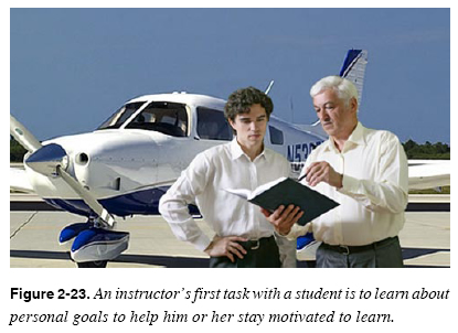 Student Questionnaire A short questionnaire can be helpful in gathering additional student background information. For example, it is helpful to know a student’s familiarity with the subject matter. Questions such as “Have you ever taken a course in aircraft maintenance?” or “Have you ever flown a small airplane?” or “Have you had any on-the-job training in avionics?” should garner the type of information needed. A short questionnaire also offers an instructor the chance to discover how the student learns best (small groups, independent study, etc.). Another possible way to gather information about a student is to have him or her write a brief autobiography which includes any experience with the subjects being taught. However an instructor gathers information about students, the information helps the instructor allow for not only personal learning goals for the course, but also the goals and motivations of the students, their background in aviation training, as well as their learning preferences. An instructor armed with this information can make the learning experience beneficial to all involved. Maintaining Motivation Motivation is generally not something that can be transferred from one person to another. Instructors must become skillful at recognizing problems with motivation and at encouraging students to continue to do their best. Rewarding Success Positive feedback encourages students. Practice positive feedback frequently by:
