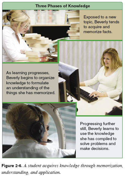 Insight Insight involves the grouping of perceptions into meaningful wholes. Creating insight is one of the instructor’s major responsibilities. To ensure that this occurs, it is essential to keep each student constantly receptive to new experiences and to help the student understand how each piece relates to all other pieces of the total pattern of the task to be learned. For example, during straight-and-level flight in an aircraft with a fixed-pitch propeller, the revolutions per minute (rpm) increase when the throttle is opened and decrease when it is closed. On the other hand, rpm changes can also result from changes in aircraft pitch attitude without changes in power setting. Obviously, engine speed, power setting, airspeed, and aircraft attitude are all related. True learning requires an understanding of how each factor may affect all of the others and, at the same time, knowledge of how a change in any one of them may affect all of the others. This mental relating and grouping of associated perceptions is called insight. Insight almost always occurs eventually, whether or not instruction is provided. For this reason, it is possible for a person to become an electrician by trial and error, just as one may become a lawyer by reading law. Instruction, however, speeds this learning process by teaching the relationship of perceptions as they occur, thus promoting the development of the student’s insight. As perceptions increase in number, the student develops insight by assembling them into larger blocks of learning. As a result, learning becomes more meaningful and more permanent. Forgetting is less of a problem when there are more anchor points for tying insights together. It is a major responsibility of the instructor to organize demonstrations and explanations, and to direct practice so that the student has better opportunities to understand the interrelationship of the many kinds of experiences that have been perceived. Pointing out the relationships as they occur, providing a secure and nonthreatening environment in which to learn, and helping the student acquire and maintain a favorable self-concept are key steps in fostering the development of insight. Acquiring Knowledge Part of an aviation instructor’s job is helping students acquire knowledge. In this context, knowledge refers to information that humans are consciously aware of and can articulate. For example, knowledge of the fuel capacity of a particular aircraft, understanding how an internal combustion engine works, and the ability to determine the weight and balance of an aircraft are examples of knowledge. Figure 2-6 shows the three phases of knowledge, a progression of how students acquire knowledge. Some practical considerations about learning new knowledge and instructor actions that help students acquire knowledge are summarized.