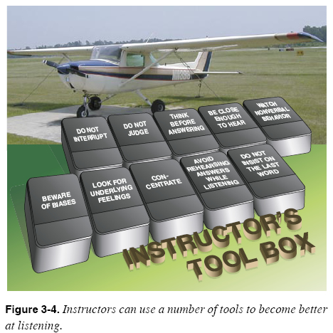 Listening Instructors must know something about their students in order to communicate effectively. As discussed earlier, an instructor needs to determine the abilities of the students and understand the students to properly communicate. One way of becoming better acquainted with students is to be a good listener. Instructors can use a number of techniques to become better at listening. It is important to realize that in order to master the art of listening, an attitude of wanting to listen must be developed. [Figure 3-4]