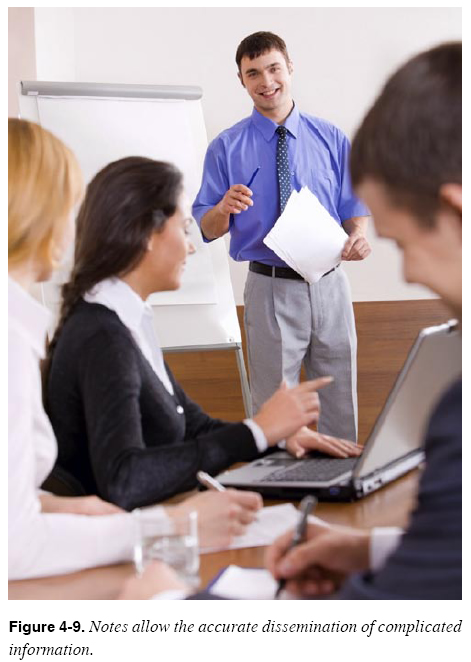 Use of Notes An instructor who is thoroughly prepared or who has made the presentation before can usually speak effectively without notes. If the lecture has been carefully prepared, and the instructor is completely familiar with the outline, there should be no real difficulty. Notes used wisely can ensure accuracy, jog the memory, and dispel the fear of forgetting. They are essential for reporting complicated information. For an instructor who tends to ramble, notes are a must because they help keep the lecture on track. The instructor who requires notes should use them sparingly and unobtrusively, but at the same time should make no effort to hide them from the students. Notes may be written legibly or typed, and they should be placed where they can be consulted easily, or held, if the instructor walks about the room. [Figure 4-9]