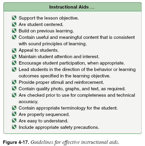 Aids should be simple and compatible with the learning outcomes to be achieved. Obviously, an explanation of elaborate equipment may require detailed schematics or mock-ups, but less complex equipment may lend itself to only basic shapes or figures. Since aids are normally used in conjunction with a verbal presentation, words on the aid should be kept to a minimum. In many cases, visual symbols and slogans can replace in-depth explanations. The instructor should avoid the temptation to use the aids as a crutch. The tendency toward unnecessarily distracting artwork also should be avoided. Instructional aids should appeal to the student and be based on sound principles of instructional design. When practical, they should encourage student participation. They also should be meaningful to the student, lead to the desired behavioral or learning objectives, and provide appropriate reinforcement. Aids that involve learning a physical skill should guide students toward mastery of the skill or task specified in the lesson objective. Instructional aids have no value in the learning process if they cannot be heard or seen. Recordings of sounds and speeches should be tested for correct volume and quality in the actual environment in which they will be used. Visual aids must be visible to the entire class. All lettering and illustrations must be large enough to be seen easily by the students farthest from the aids. Colors, when used, should provide clear contrast and easily be visible. The usefulness of aids can be improved by proper sequencing to build on previous learning. Frequently, good organization and natural patterns of logic dictate the sequence. However, use of standardized materials, including a syllabus, is recommended. Sequencing also can be enhanced simply by using overlays on transparencies, stripping techniques on charts and chalk or marker boards, and by imaginative use of magnetic boards. Sequencing can be emphasized and made clearer by the use of contrasting colors. The effectiveness of aids and the ease of their preparation can be increased by initially planning them in rough draft form. Revisions and alterations are easier to make at that time than after their completion. The rough draft should be carefully checked for technical accuracy, proper terminology, grammar, spelling, basic balance, clarity, and simplicity. Instructional aids should also be reviewed to determine whether their use is feasible in the training environment and whether they are appropriate for the students. [Figure 4-17]