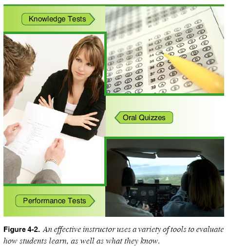 Management Skills Management skills generally include the ability to plan, organize, lead, and supervise. For the effective instructor, these skills are reflected in the ability to plan, organize, and carry out a lesson. A well-planned lesson means the instructor is also practicing time management skills and ensures the time allocated for the lesson is well used. As discussed in Chapter 1, Human Behavior, the average age of aviation students is 34 years old. Unlike younger students, no law requires they attend school, they are paying for the training, and they expect the instructor to make wise use of their time. To manage time well, it is important that an instructor look at the time available and plan how to use the time to achieve the lesson goals. An effective instructor understands what can be realistically achieved within the allotted time, makes the best use of the time available, allows enough time for what must be done, preserves contingency time to handle the unexpected, and minimizes stress by not planning too much for the allotted time. Management skills also come into play for the aviation instructor who is teaching a class of students. For this instructor, effective management of the classroom promotes learning. Consider the opening scenario in which Bob arrived early for the class and ensured the classroom was well lit, the desks in order, and that the room presented a neat overall appearance. He also made sure the computer and projector were in working order. These steps contribute to a positive learning environment. Another management skill that enhances the effectiveness of aviation instructors is supervision of the students. For the flight instructor, this may entail overseeing the preflight procedures. For the maintenance instructor, this may mean monitoring the replacement of a carburetor. While it is important to provide hands-on tasks in the lesson plan to engage students in active learning, it is also important to ensure the tasks are completed safely and correctly. Assessment Skills In Chapter 2, The Learning Process, learning was defined as “a change in the behavior of the learner as a result of experience. The behavior can be physical and overt, or it can be intellectual or attitudinal.” This change is measurable and therefore can be assessed. Assessment of learning is a complex process and it is important to be clear about the purposes of the assessment. There are several points at which assessments can be made: before training, during training, and after training. Learning assessment is another important skill of an effective instructor. [Figure 4-2] This topic is discussed in detail in Chapter 5, Assessment.