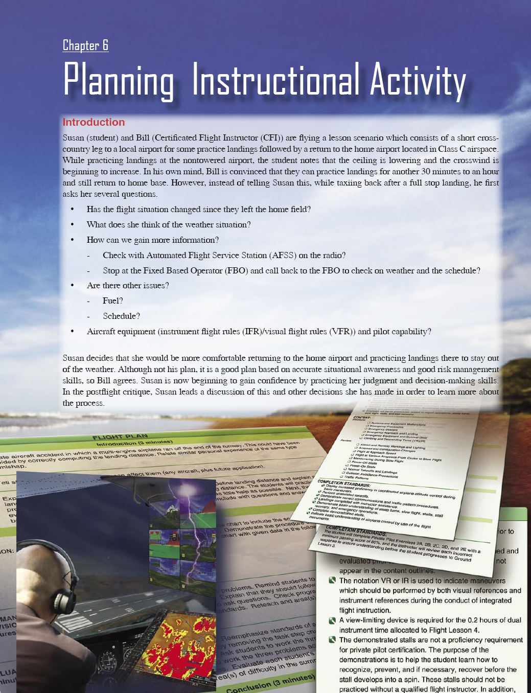 In the past, the aviation instructor was a capable pilot or aviation technician with a rather general understanding of basic teaching methods and techniques. More recently, the Federal Aviation Administration (FAA) has paid more attention to the instructor’s role as teacher and mentor, and has provided a much better grounding in instructional techniques. The instructor is now required to master the teaching methods, write lesson objectives, outline and write lesson plans, and motivate students by example. The instructor is responsible for what is taught in the aircraft and classroom. The amount of learning that takes place is a direct result of how well the lesson is prepared and the teaching skill of the instructor. Historically, aviation instruction focused on the performance of specific procedures and/or maneuvers, and learning was measured with objective standards. Changing technology and innovations in learning provide today’s aviation instructors with the opportunity to use new methods and teach to new standards. One of these methods, introduced in Chapter 4, The Teaching Process, is scenario-based training (SBT). While SBT is an integral component of today’s aviation training, the instructor is crucial to its implementation. By emphasizing SBT, the instructor functions in the learning environment as an advisor and guide for the learner. Whatever the method of teaching, the key to developing well-planned and organized aviation instruction includes using lesson plans and a training syllabus that meet all regulatory certification requirements. Much of the basic planning necessary for the flight instructor and maintenance instructor is provided by the knowledge and proficiency requirements published in Title 14 of the Code of Federal Regulations (14 CFR) parts 61 and 65, approved school syllabi, and the various texts, manuals, and training courses available. This chapter reviews the planning required by the professional aviation instructor as it relates to four key topics—course of training, blocks of learning, training syllabus, and lesson plans. It also explains how to integrate SBT, aeronautical decision-making (ADM), and risk management into the aviation training lesson. |