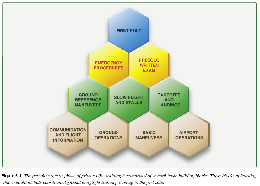 Course of Training As discussed in chapter 4, a course of training is a series of studies leading to attainment of a specific goal such as a certificate of completion, graduation, or an academic degree. An instructor plans instructional content around the course of training by determining the objectives and standards, which in turn determine individual lesson plans, test items, and levels of learning. For a complete discussion of determining these items, see chapter 4. Blocks of Learning After the overall training objectives have been established, the next step is the identification of the blocks of learning which constitute the necessary parts of the total objective. Just as in building a pyramid, some blocks are submerged in the structure and never appear on the surface, but each is an integral and necessary part of the structure. Thus, the various blocks are not isolated subjects, but essential parts of the whole. During the process of identifying the blocks of learning to be assembled for the proposed training activity, the instructor must also examine each block to ensure it is an integral part of the structure. Extraneous blocks of instruction are expensive frills, especially in flight instruction, and detract from, rather than assist in, the completion of the final objective. While determining the overall training objectives is a necessary first step in the planning process, early identification of the foundation blocks of learning is also essential. Training for any such complicated and involved task as piloting or maintaining an aircraft requires the development and assembly of many segments or blocks of learning in their proper relationships. In this way, a student can master the segments or blocks individually and can progressively combine these with other related segments until their sum meets the overall training objectives. The blocks of learning identified during the planning and management of a training activity should be fairly consistent in scope. They should represent units of learning which can be measured and evaluated—not a sequence of periods of instruction. For example, the flight training of a private pilot might be divided into the following major blocks: achievement of the knowledge and skills necessary for solo, the knowledge and skills necessary for solo cross-country flight, and the knowledge and skills appropriate for obtaining a private pilot certificate. [Figure 6-1]