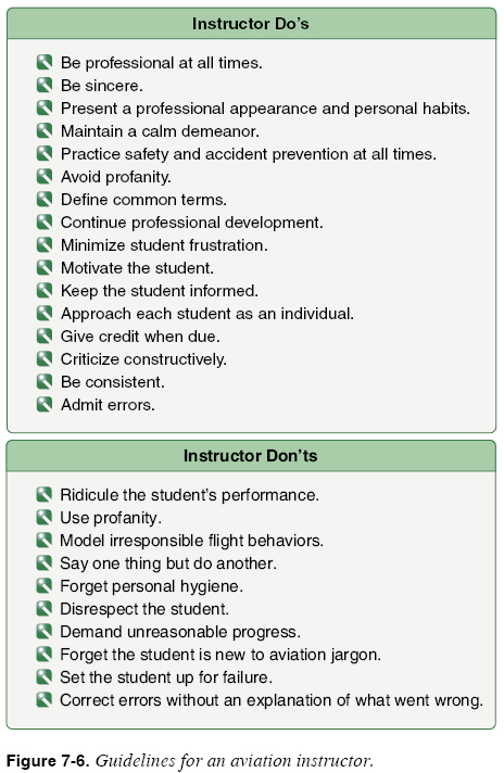 Each section provides flight instructors a list of principles and sample recommended practices. Successful instructor pilots continue to self-evaluate and find ways to make themselves safer and more productive instructors. The Aviator’s Model Code of Conduct provides guidance and principles for the instructor to integrate into their own practices. More information about the Aviator’s Model Code of Conduct can be found at www.secureav.com. Safety Practices and Accident Prevention Aviation instructors are on the front line of efforts to improve the safety record of the aviation industry. Safety, one of the most fundamental considerations in aviation training, is paramount. FAA regulations intended to promote safety by eliminating or mitigating conditions that can cause death, injury, or damage are comprehensive, but even the strictest compliance with regulations may not be sufficient to guarantee safety. Rules and regulations are designed to address known or suspected conditions detrimental to safety, but there is always a chance that some new combination of circumstances not contemplated by the regulations will arise. It is important for aviation instructors to be proactive to ensure the safety of flight or maintenance training activities. The safety practices aviation instructors emphasize have a long-lasting effect on students. Generally, students consider their instructor to be a role model whose habits they attempt to imitate, whether consciously or unconsciously. The instructor’s advocacy and description of safety practices mean little to a student if the instructor does not demonstrate them consistently. For example, if a maintenance student observes the instructor violating safety practices by not wearing safety glasses around hazardous equipment, the student probably will not be conscientious about using safety equipment when the instructor is not around. One of the best actions a flight or maintenance instructor can take to enhance aviation safety is to emphasize safety by example. Another way for the instructor to advocate safety is to join the new FAA Safety Team (FAASTeam). The FAASTeam is dedicated to improving the aviation safety record by conveying safety principles and practices through training, outreach, and education. More information is available at FAASafety.gov. Professionalism The aviation instructor is the central figure in aviation training and is responsible for all phases of required training. The instructor, either pilot or aircraft maintenance technician, must be a professional. As professionals, aviation instructors strive to maintain the highest level of knowledge, training, and currency in the field of aviation. To achieve this goal, instructors need to commit themselves to continuous, lifelong learning and professional development through study, service, and membership in professional organizations such as the National Association of Flight Instructors (NAFI) and Professional Aviation Mechanics Association (PAMA). Professionals build a library of resources that keeps them in touch with their field through the most current procedures, publications, and educational opportunities. Being a professional also means behaving in a professional manner. [Figure 7-6] An aviation instructor should strive to practice the characteristics on the Instructor Do’s list when teaching a student.