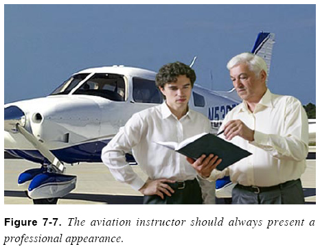 Sincerity An aviation instructor should be straightforward and honest. Attempting to hide inadequacy behind a smokescreen of unrelated instruction makes it impossible for the instructor to command the respect and full attention of a student. Teaching an aviation student is based upon acceptance of the instructor as a competent, qualified teacher and an expert pilot or aircraft maintenance technician. Any facade of instructor pretentiousness, whether it is real or mistakenly presumed by the student, causes the student to lose confidence in the instructor, and learning is adversely affected. Acceptance of the Student The instructor must accept students as they are, including all their faults and problems. The student is a person who wants to learn, and the instructor is a person who is available to help in the learning process. Beginning with this understanding, the professional relationship of the instructor with the student should be based on a mutual acknowledgement that the student and the instructor are important to each other, and that both are working toward the same objective. Under no circumstance should the instructor do anything which implies degrading the student. Acceptance (rather than ridicule) and support (rather than reproof) encourage learning. Students must be treated with respect, regardless of whether they are quick to learn or require more time to absorb certain concepts. Criticizing a student who does not learn rapidly is similar to a doctor reprimanding a patient who does not get well as rapidly as predicted. Personal Appearance and Habits Personal appearance has an important effect on the professional image of the instructor. Today’s aviation customer expects an instructor to be neat, clean, and appropriately dressed. Since the instructor is engaged in a learning situation, the attire worn should be appropriate to professional status. [Figure 7-7]
