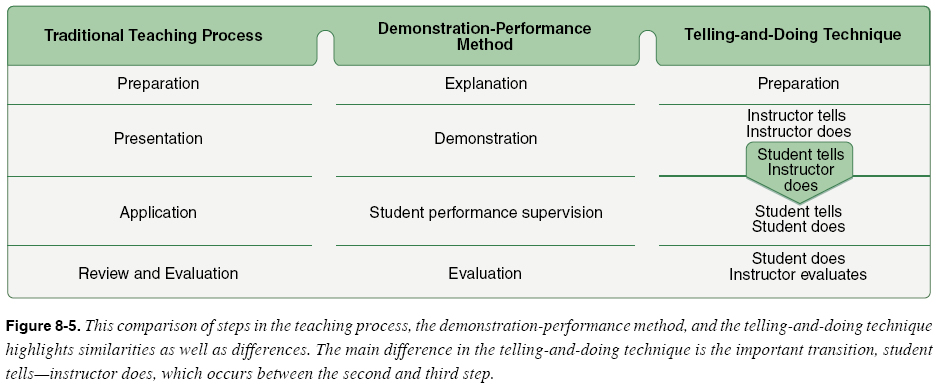 The Telling-and-Doing Technique The demonstration-performance method can be applied to the telling-and-doing technique of flight instruction in three steps. However, the telling-and-doing technique includes specific variations for flight instruction. [Figure 8-5]