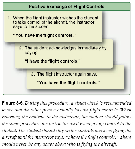 Background Incident/accident statistics indicate a need to place additional emphasis on the exchange of control of an aircraft by pilots. Numerous accidents have occurred due to a lack of communication or misunderstanding regarding who had actual control of the aircraft, particularly between students and flight instructors. Establishing the following procedure during initial training will ensure the formation of a habit pattern that should stay with students throughout their flying careers. Procedure During flight training, there must always be a clear understanding between students and flight instructors about who has control of the aircraft. The preflight briefing should include procedures for the exchange of flight controls. A positive three-step process in the exchange of flight controls between pilots is a proven procedure and one that is strongly recommended. When an instructor is teaching a maneuver to a student, the instructor normally demonstrates the maneuver first, then has the student follow along on the controls during a demonstration and, finally, the student performs the maneuver with the instructor following along on the controls. [Figure 8-6]