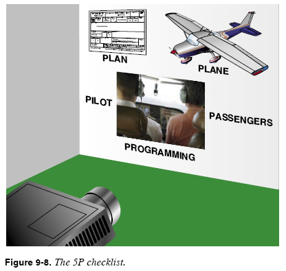 SRM and the 5P Check SRM is about gathering information, analyzing it, and making decisions. Learning how to identify problems, analyze the information, and make informed and timely decisions is not as straightforward as the training involved in learning specific maneuvers. Learning how to judge a situation and “how to think” in the endless variety of situations encountered while flying out in the “real world” is more difficult. There is no one right answer in ADM; rather, each pilot is expected to analyze each situation in light of experience level, personal minimums, and current physical and mental readiness level, and make his or her own decision. SRM sounds good on paper, but it requires a way for pilots to understand and use it in their daily flights. One practical application is called the “Five Ps” (5 Ps). [Figure 9-8] The 5 Ps consist of “the Plan, the Plane, the Pilot, the Passengers, and the Programming.” Each of these areas consists of a set of challenges and opportunities that face a single pilot. And each can substantially increase or decrease the risk of successfully completing the flight based on the pilot’s ability to make informed and timely decisions. The 5 Ps are used to evaluate the pilot’s current situation at key decision points during the flight, or when an emergency arises. These decision points include preflight, pretakeoff, hourly or at the midpoint of the flight, predescent, and just prior to the final approach fix or for visual flight rules (VFR) operations, just prior to entering the traffic pattern.