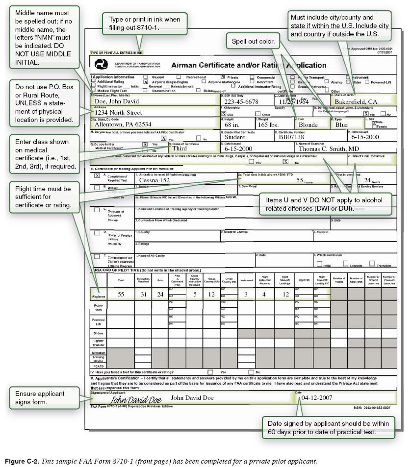 Federal Aviation Administration (FAA) inspectors and designated pilot examiners (DPEs) rely on flight instructor recommendations for student or pilot applicant testing. These recommendations are accepted as evidence of qualification for certification and proof that a review of the subject areas found to be deficient on the appropriate knowledge test has been given by the flight instructor. Recommendations also provide assurance the applicant has had a thorough briefing on the Practical Test Standards (PTS) and the associated knowledge areas, maneuvers, and procedures. If the flight instructor has trained and prepared the applicant competently, the applicant should have no difficulty in passing the written and practical tests. Sport Pilot Many consider the advent of the sport pilot certification to be one of the most significant changes to the airman certification structure to have occurred in over 50 years. Because of the growing cost to acquire the private pilot certification, more and more aviation enthusiasts are considering the sport pilot as an alternative. Many aircraft already meet the light sport aircraft criteria, and many manufacturers are now producing modern light sport aircraft. It is likely that flight instructors will be asked to provide information, and possibly, training for this new certificate. Flight instructors should review 14 CFR part 61, subparts J and K, for the requirements for, and privileges and limitations of, the sport pilot certifications as well as the new endorsement requirements. Of particular interest has been the medical requirement. Subparts J and K also describe the process for sport pilots and flight instructors with a sport pilot rating to add additional category/class privileges. Since light sport aircraft must meet certain criteria, a well-informed flight instructor would be expected to be acquainted with the basic requirements. FAA Forms 8710-1, 8610-2, and 8710-11 Forms 8710-1, 8610-2, and 8710-11 are the print versions of the Airman Certificate and/or Rating Application. Again, the instructor ensures the applicant is prepared for the test and has met all the regulatory requirements, including knowledge, proficiency, required endorsements, and experience requirements before the application process. The applicant then either completes the 8710 or 8610 paper form by hand or completes a digital computer-based form found on the FAA website. This form is in PDF. Remind the student that while the form can be completed online, the data cannot be saved and the applicant must print a copy before closing the window or the data will be lost. Instructions for completing the form are available on the website. After printing the requisite form, the applicant physically signs it and then the instructor verifies the information and signs the form, which the DPE mails to the nearest FSDO. Downloadable versions of the FAA Forms 8710-1 and 8610-2 are available at www.faa.gov/library/forms/. Figures C-2 and C-3 are examples of a private pilot applicant who received training under 14 CFR part 61. This is only an example, since the form is periodically revised to reflect changes in the applicable rules and regulations. If the current form is a later edition than the one shown here, the instructions must be read very carefully to ensure all areas of the form are filled out correctly. The example shown is annotated with additional guidance to clarify or reinforce certain areas that are frequently found incomplete by the FAA during the certification process. Instructor Records 14 CFR part 61 requires the flight instructor to maintain a record that includes information on the type of endorsement, the name of the person receiving the endorsement, and the date of the endorsement. This information must be kept in a logbook or a separate document. For a knowledge or practical test endorsement, the record must include the kind of test, the date, and the results. Records of endorsements must be maintained for at least 3 years. Knowledge Tests When preparing an applicant for the private certification or higher grade rating (e.g., commercial or instrument), a test is required to ensure the student has adequate aeronautical knowledge in those subject areas listed in 14 CFR part 61. The flight instructor may provide the student with an endorsement to certify he or she has the required knowledge to pass the knoweldge test. Some additional ratings do not require a knowledge test. For information concerning additional aircraft certifications that do not require knowledge tests, refer to AC 61-65. Flight instructors must take a short question test for additional category. As a general rule the following may be used to determine if a knowledge test for Private, Commercial, or Instrument rating is required, but the flight instructor should review 14 CFR part 61. If the applicant fails a knowledge test, the flight or ground instructor must sign the written test after he or she has given additional training for a retake of the test. Additional Training and Endorsements Flight instructors often provide required training and endorsements for certificated pilots. AC 61-98, Currency and Additional Qualification Requirements for Certificated Pilots, contains information to assist the instructor in providing training/endorsements for flight reviews, instrument proficiency checks, and transitions to other makes and models of aircraft. Included in the AC are general guidance in each of these areas, references to other related documents, and sample training plans that are pertinent to this type of training.