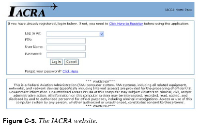 Integrated Airman Certification and/or Rating Application (IACRA) In the fall of 2003, the FAA released the Integrated Airman Certification and/or Rating Application, an Internet-based database program providing a fully electronic method of applying for an airman certificate or rating located at http://acra.faa.gov/iacra/. It electronically captures and validates airman information required to complete the airman application. IACRA can be accessed from any location with Internet connectivity. [Figure C-5] IACRA interfaces with multiple FAA national databases to validate data and verify specific fields. IACRA automatically ensures applicants meet regulatory and policy requirements through business rules and data validation. It implements use of digital signatures throughout the certification process. IACRA automatically forwards the 8710 application and test results to the Airman Registry. IACRA replaces the Airmen Certification and/or Rating Application CD, (ACRA), a stand-alone computer-based PC program that was the FAA’s first effort to automate the application process. With new “paths” of application added weekly, the IACRA program team continues to develop IACRA’s capability. Currently, the program can process virtually all pilot applications from sport pilot through airline transport pilot (ATP) type ratings, certificated flight instructors, mechanics, and most repairmen. If the applicant chooses to complete the Airman Certificate and/or Rating Application utilizing IACRA, the instructor should ensure the applicant is prepared for the test and has met all the regulatory requirements, including knowledge, proficiency, required endorsements, and experience requirements. Suggest the applicant visit the IACRA site, review the frequently asked questions, and read the document “Getting Started Desktop Instructions” before completing an application. Stress the importance of the applicant having all pertinent information readily available before logging in. If the applicant has all necessary information available, the process should not take over ten minutes. Remind the applicant the instructor can supervise the application process. Or the instructor can log onto IACRA any time after the applicant has completed the initial process and call up the application based on the FAA Tracking Number (FTN) assigned to the applicant. When using IACRA, the applicant must complete the applicant’s section, and the instructor certifies the applicant’s information. An online public-accessible training center for IACRA, hosted by the FAA Safety Team (FAASTeam) at http://faasafety.gov/ is under development. When operational, there will be a link on the IACRA website to the training center. A number of different training aids to include a fully interactive practice IACRA program will be available. This program will enable the instructor to fill out practice applications, review them and sign them off, giving the instructor a better feel for the entire process. Student Pilot Endorsements Title 14 of the Code of Federal Regulations (14 CFR) section (§) 61.189 requires instructors to sign the logbook of each person they have given ground or flight training. Advisory Circular (AC) 61-65 contains suggested endorsements, and this appendix reprints several of the more commonly used endorsements. All of these examples contain the essential elements, but it is not necessary for endorsements to be worded exactly as those in the AC. For example, changes to regulatory requirements may affect the wording or the instructor may customize the endorsement for any special circumstances of the student. Pre-solo aeronautical knowledge: 14 CFR § 61.87(b) Pre-solo flight training at night: 14 CFR § 61.87(c) and (m) Solo flight (each additional 90-day period): 14 CFR § 61.87(n) Initial solo cross-country flight: 14 CFR § 61.93(c)(1) Solo cross-country flight: 14 CFR § 61.93(c)(2) Solo flight in Class B airspace: 14 CFR § 61.95(a) Solo flight to, from, or at an airport located in Class B airspace: 14 CFR §§ 61.95(b) and 91.131(b)(1) Private Pilot Endorsements Flight proficiency/practical test: 14 CFR §§ 61.103(f), 61.107(b), and 61.109 Flight Instructor Endorsements Additional Endorsements Completion of an instrument proficiency check: 14 CFR § 61.57(d)