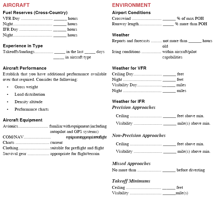 Each item provides you with either a space to complete a personal minimum or a checklist item to think about. Spend some quiet time completing each blank and consider other items that apply to your personal minimums. Give yourself permission to choose higher minimums than those specified in the regulations, aircraft flight manuals, or other rules. How To Use Your Checklist Use this checklist just as you would use one for your aircraft. Carry the checklist in your flight kit. Use it at home as you start planning a flight and again just before you make your final decision to fly. Be wary if you have an item that’s marginal in any single risk factor category. But if you have items in more than one category, you may be headed for trouble. If you have marginal items in two or more risk factors/categories, do not go! Periodically review and revise your checklist as your personal circumstances change, such as your proficiency, recency, or training. You should never make your minimums less restrictive unless a significant positive event has occurred. However, it is okay to make your minimums more restrictive at any time. And never make your minimums less restrictive when you are planning a specific flight, or else external pressures will influence you. Have a fun and safe flight! PILOTExperience/Recency Takeoffs/landings..................... _____ in the last _____ days Hours in make/model ................ _____ in the last _____ days Instrument approaches ............ _____ (simulated or actual) in the last _____ days Instrument flight hours ............._____ (simulated or actual) in the last _____ days Terrain and airspace ................. familiar Physical Condition