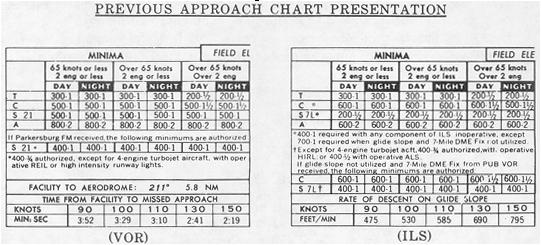 Standard Instrument Departure (SID) Charts are designed to expedite clearance delivery and to facilitate transition between takeoff and enroute operations. These charts, published in two bound booklets, provide departure routing clearance in graphic and textual form. Standard Terminal Arrival Route (STAR) Charts are designed to expedite air traffic control arrival route procedures and to facilitate transition between enroute and instrument approach operations. These charts, published in one bound booklet, provide arrival route procedures in graphic and textual form. Enroute Low Altitude Charts provide aeronautical information for enroute navigation (IFR) in the low altitude stratum. Area Charts, which are part this series, furnish terminal data in a larger scale in congested areas. Enroute High Altitude Charts provide aeronautical information for enroute instrument navigation (IFR) in the high altitude stratum. Instrument Approach Procedure Charts portray the aeronautical data which is required to execute instrument approaches to airports. Each procedure is designed for use with a specific type of electronic navigational aid. These charts reflect the criteria associated with the U.S. Standards for Terminal Instrument Approach Procedures (TERPs). Detailed information regarding their use is contained in Advisory Circular 90-1A, Civil Use of U.S. Government Instrument Approach Procedure Charts, which is reproduced in the following pages of this chapter. Regarding helicopter minimums, FAR 97.3(d-1) states, "Helicopters may also use ... the Category A minimum descent altitude (MDA) or decision height (DH). The required visibility minimum may be reduced to one-half the published visibility minimum for Category A aircraft, but in no case may it be reduced to less than one-quarter mile or 1,200 feet RVR."