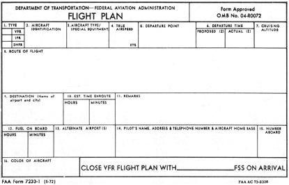 As specified in FAR 91, if you plan to operate an aircraft in controlled airspace under Instrument Flight Rules, you must file an IFR flight plan and receive an appropriate ATC clearance. If your flight is to be in controlled airspace, your initial contact with Air Traffic Service involves your flight plan. The "Preflight" section of the chapter titled "Air Traffic Control" in the AIRMAN'S INFORMATION MANUAL provides guidance for completing the FAA Flight Plan, Form 7233-1 (Fig. 12-1). The forms are available at FSSs, flight planning rooms in airport terminal buildings, and at other convenient locations.