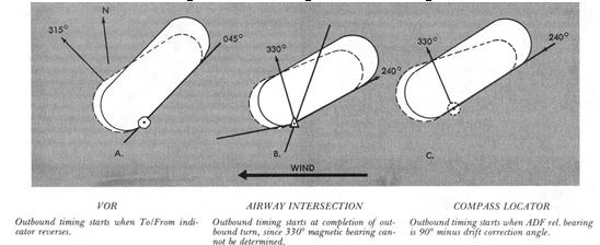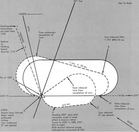 No other time adjustments are necessary unless ATC specifies a time to leave the holding fix, as on a timed approach (see Fig. 12-4). Any necessary reduction in holding time will depend upon the time required to complete a circuit of the pattern. If, for example, a complete circuit requires 4 1/2 minutes, and the fix departure time is 12 minutes after passage over the fix, fly two more patterns (9 minutes) and shorten the outbound leg on the last circuit to provide for a total of 1 minute except for the turns, which at 3° per second will take 2 minutes. Precise timing requires rapid cross-check and planning, in addition to the attention devoted to basic attitude control, tracking, and ATC communications.