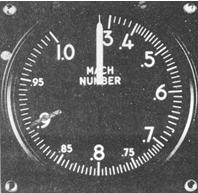 The Mach indicator (Fig. 4-15) is found on more recently developed high performance aircraft. It indicates the ratio of aircraft true airspeed to the speed of sound at flight altitude. The Mach pointer is actuated mechanically by the pressure differential between impact air and static air pressure. In computing a true airspeed from indicated airspeed, air density must be taken into account. This requires a correction for temperature and altitude. With a Mach number, these corrections are unnecessary because the existing temperature at flight level determines the speed of sound at flight level. The Mach number is determined by the speed of sound, which in turn is determined by air density; thus, Mach is always a valid index to the speed of the aircraft.