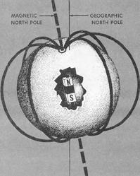 A magnet is a piece of metal that has the property of attracting another metal. The force of attraction is greatest at the poles or points near each end of the magnet; and the least attraction is in the area halfway between the two poles. Lines of force flow from each of these poles in all directions, bending around and flowing toward the other poles to form a magnetic field. Such a magnetic field surrounds the Earth, with the lines of force oriented approximately to the north and south magnetic poles (Fig. 4-31).
