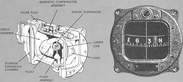 The magnetic compass is a simple self-contained instrument (Fig. 4-34). Two steel magnetized needles are mounted on a float, with a compass card attached around the float. The needles are parallel, with their north-seeking end pointed in the same direction. The compass card has letters for cardinal headings - N. E. S. W. Each 30° interval of direction is represented by a number from which the last zero is omitted. Between the numbers, the card is graduated for each 5°. The float assembly, consisting of the magnetized needles, compass card, and float, is mounted on a pedestal and sealed in a chamber filled with an acid-free white kerosene.