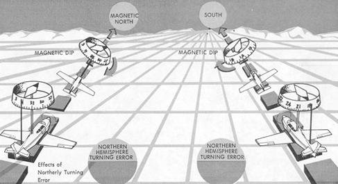 Northerly turning error (Fig. 4-35) is the most pronounced of the dip errors. Due to the mounting of the magnetic compass, its center of gravity is below the pivot point on the pedestal and the card is well balanced in the fluid. When the aircraft is banked, the card is also banked as a result of centrifugal force. While the card is in the banked attitude, the vertical component of the Earth's magnetic field causes the north-seeking ends of the compass to dip to the low side of the turn, giving an erroneous turn indication. This error is most apparent on headings of north and south. When making a turn from a heading of north, the compass briefly gives an indication of a turn in the opposite direction. When making a turn from south, it gives an indication of a turn in the correct direction but at a much faster rate than is actually occurring.