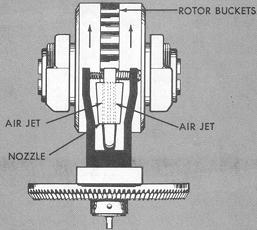The source of power for the gyro is the engine-driven vacuum pump (or venturi) which sucks air from the rear of the instrument case. This causes air under atmospheric pressure to pass through the filtering system, thence through an air bearing into the hollow vertical gimbal ring. The air then passes through the air nozzle and jets, striking the rotor at a point just above the plane of the horizontal gimbal.