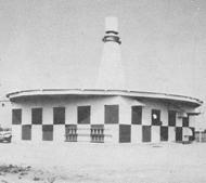 a small low building topped with a flat white disc upon which are located