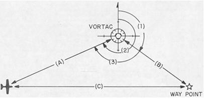 The course line computer is based on azimuth and distance information generated by the present VORTAC system. It is also called the "Rho-Theta" system. Rho (distance) is derived from the distance measuring feature of the VORTAC, and Theta (bearing) information is derived from the azimuth feature. As shown in Figure 7-18, the value of side (A) is the measured DME distance to the VORTAC. Side (B), the distance from the VORTAC to the waypoint, and angle (1), the bearing from the VORTAC to the waypoint, are set in the cockpit control. The bearing from the VORTAC to the aircraft, angle (2), is measured by the VOR receiver. The airborne computer compares angles (1) and (2) and determines angle (3). With this information, the computer, by means of simple trigonometric functions, continuously solves for side (c), which is the distance in nautical miles and magnetic course from the aircraft to the waypoint. This is presented as guidance information on the cockpit display.