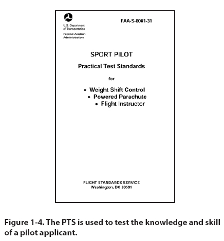 Chapter 1 - Introduction to the Powered Parachute Powered Parachute Terms Different terms have been used throughout the powered parachute community. [Figure 1-2] The terms standardized throughout this book are as follows: • Powered Parachute – The complete aircraft. • Cart – The engine and seats, attached by a structure to wheels; may also be referred to as the fuselage, cockpit, chaise, or airframe. • Wing – Typically a ram-air inflated and pressurized wing including lines that attach to the cart. The wing is not in position to fly until the aircraft is in motion; when not inflated, referred to as a parachute or chute. Introduction to the Powered Parachute The powered parachute is a category of aircraft that flies in a manner unique among light-sport aircraft. Three significant differences separate the PPC from other types of light sport aircraft (LSA): [Figure 1-3] 1. The wing must be inflated and pressurized by ram air prior to each takeoff. 2. The aircraft uses a pendulum configuration, where the cart hangs about 20 feet below the wing, connected via flexible suspension lines. 3. The wing is at a relatively fixed angle with the suspension lines and flies at a relatively constant speed. Other aircraft categories allow pilots to change the speed of the aircraft, but the powered parachute airspeed remains within a very small range. A powered parachute can be a single place ultralight flying vehicle, a single place light-sport aircraft, or a multi-place light-sport aircraft. The common acronyms for this vehicle/aircraft are PPC (powered parachute), PPCL (powered parachute land) or PPCS (powered parachute sea). A light-sport aircraft PPC used for sport and private flying must be registered with an FAA N-number, have an airworthiness certificate, a pilot’s operating handbook (POH), and/or limitations with a weight and balance document aboard. The aircraft must be maintained properly by the aircraft owner or other qualified personnel and have the aircraft logbooks available for inspection. Dual controls are required in the aircraft for training. Powered Parachute Pilot Certificate Eligibility Requirements You may not act as pilot in command (PIC) of a lightsport aircraft powered parachute unless you hold a pilot certificate with a powered parachute rating issued by the FAA. At this time the only pilot certificates with powered parachute ratings are Student, Sport and Private. The FAA is empowered by the U.S. Congress to promote aviation safety by prescribing safety standards for pilots and the other civil aviation programs. The Code of Federal Regulations (CFRs), formerly referred to as Federal Aviation Regulations (FARs), are one of the primary means of conveying these safety standards. Title 14 CFR, part 61 specifies the requirements to earn a pilot certificate. This regulation also states the pilot applicant must be able to read, speak, write, and understand the English language. The FAA Practical Test Standards (PTS) establish the standards for the knowledge and skills necessary for the issuance of a pilot certificate. [Figure 1-4] You should reference both these documents to understand the knowledge, skills and experience required to obtain a pilot certificate to fly a powered parachute. Pilot applicants must have a valid U.S. driver’s license or a current third-class medical certificate issued under 14 CFR part 67. If you use your valid driver’s license to exercise the privileges of a Sport Pilot certificate, then you must also adhere to any restrictions on that driver’s license. You must hold a current thirdclass medical certificate to exercise the privileges of a Private Pilot certificate. The process of learning to fly includes a combination of ground training (to include successful completion of the FAA Knowledge Exam) and flight training to include dual flights with a certified flight instructor (CFI), as well as solo flights under the supervision of your CFI. To be eligible to fly solo in a PPC, you must be at least 16 years of age and demonstrate satisfactory aeronautical knowledge on a test developed by your instructor. You must have received and logged flight training for the maneuvers and procedures in 14 CFR part 61 for the PPC, as well as demonstrated satisfactory proficiency and safety. Only after all of these requirements are met can your instructor endorse your student pilot certificate and logbook for solo flight. Once you obtain the required aeronautical knowledge and experience required by 14 CFR part 61, your flight instructor will endorse you to take a practical test (often called a “checkride”) with a sport pilot examiner (SPE) or an FAA inspector. After you’ve demonstrated satisfactory aeronautical knowledge and skill in the Areas of Operation and Tasks outlined in the PTS, this examiner or inspector will issue your temporary (paper) pilot certificate. You will receive a plastic certificate in the mail once the results of the practical test are received by the FAA Registration branch. A sport pilot is certified to fly a light-sport aircraft. To be eligible for a sport pilot certificate with a powered parachute rating, you must be at least 17 years of age, complete the specific training and flight time requirements described in 14 CFR part 61 subpart J, pass the FAA Knowledge Exam, and successfully complete the practical test. If you hold at least a private pilot certificate, but not a rating for the category and class of PPC LSA, you can operate the powered parachute with a logbook endorsement and passing a proficiency check. [Table 1] If you hold at least a private pilot certificate with a PPC category and class rating, and have a current third-class medical, then you may operate any PPC LSA in that category and class, and do not need to hold any of the endorsements required by Sport Pilots, nor do you need to comply with the limitations of a Sport Pilot certificate.