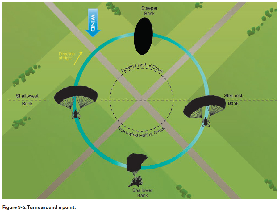 steepest bank is attained abeam of the point when the powered parachute is headed directly downwind. By entering