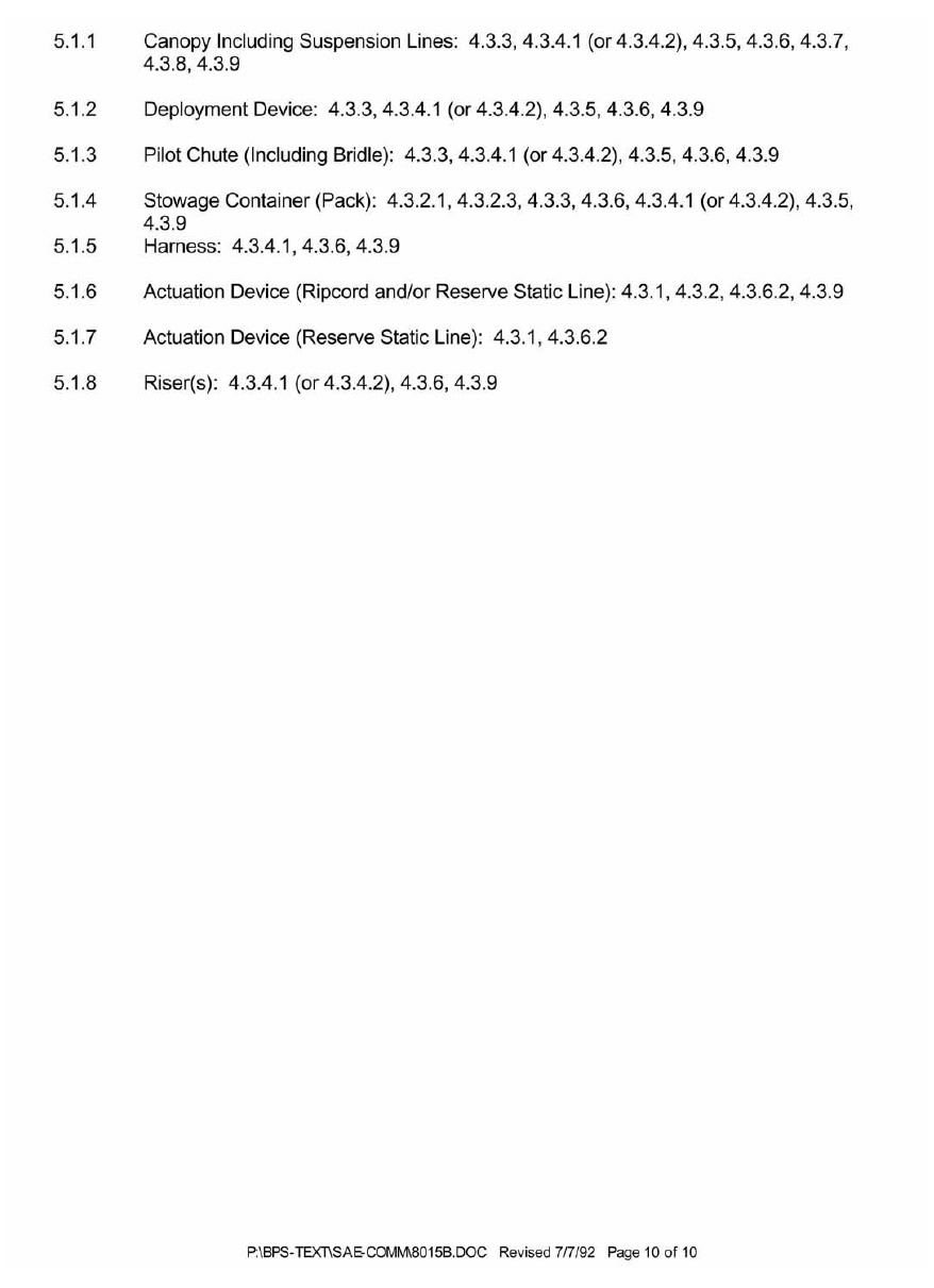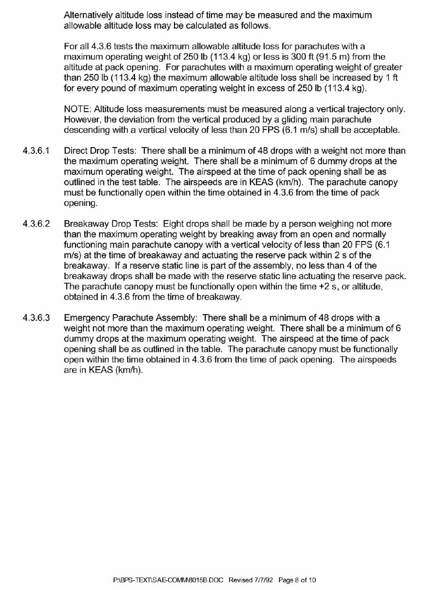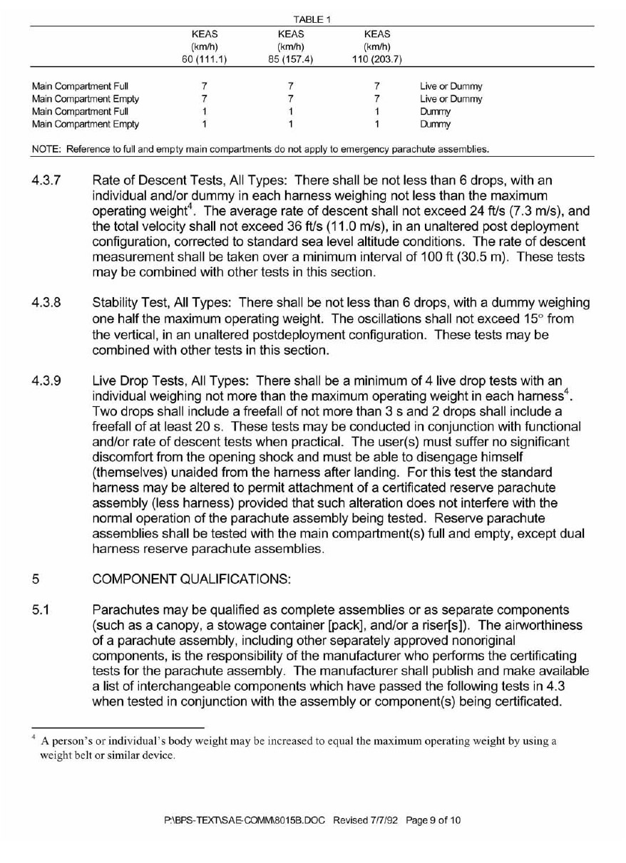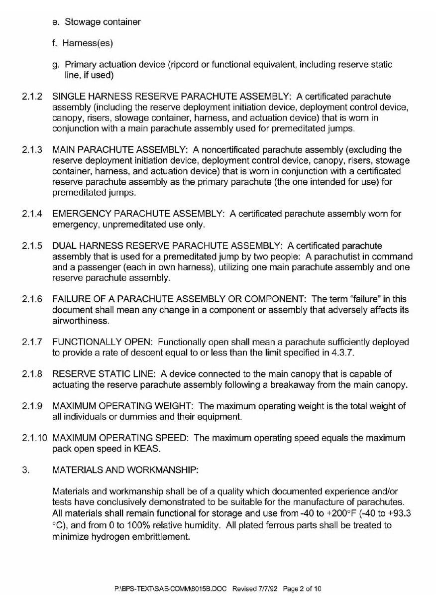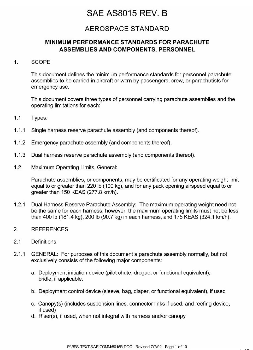 SAE AS 8015B—Minimum Performance Standards for Parachute Assemblies and Components, Personnel